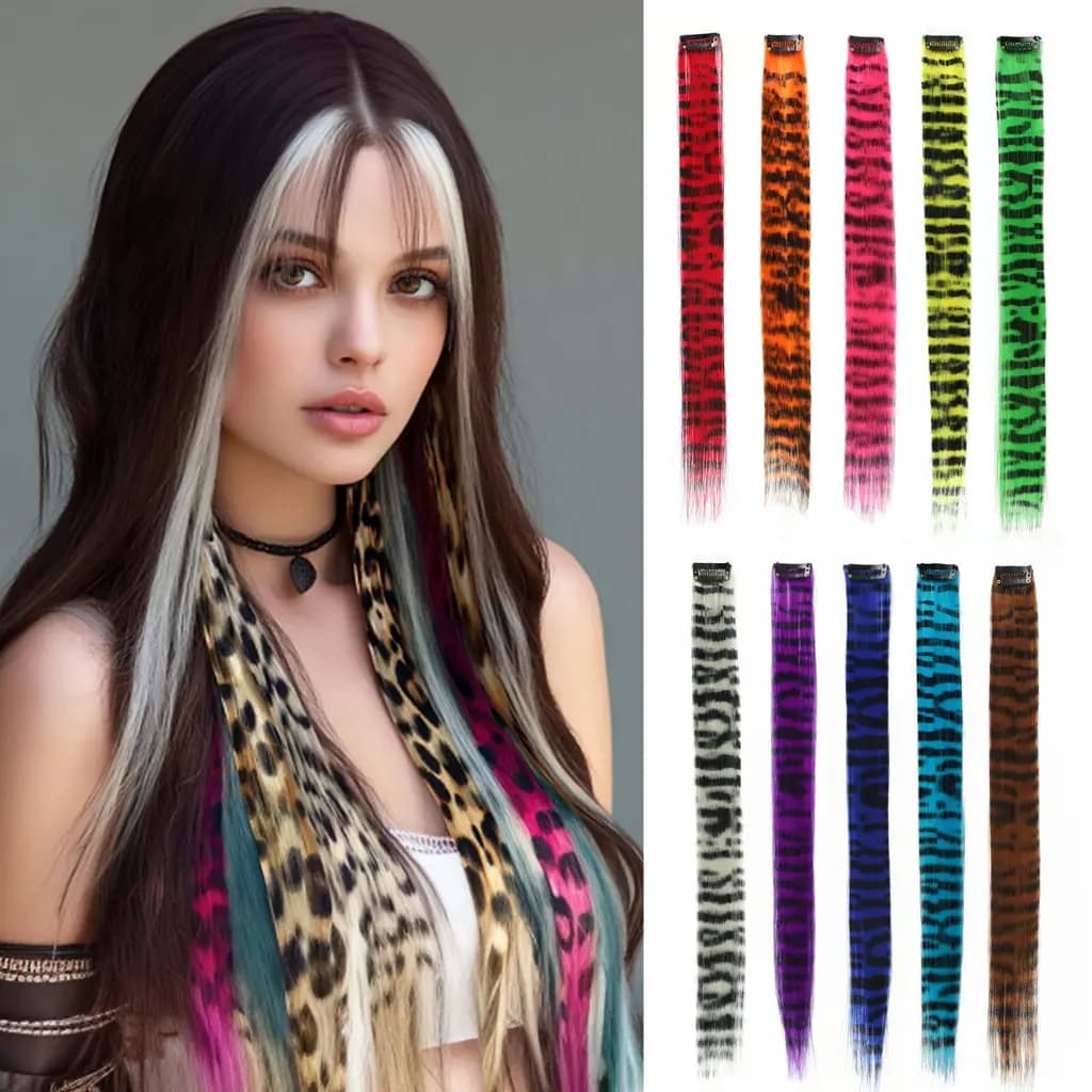 10pcs/pack Synthetic Leopard print hair extension Clip in Feather Hair 18inch Long Straight Colorful striped Hairpieces Halloween Party Cosplay Y2K Use for Women Girls